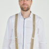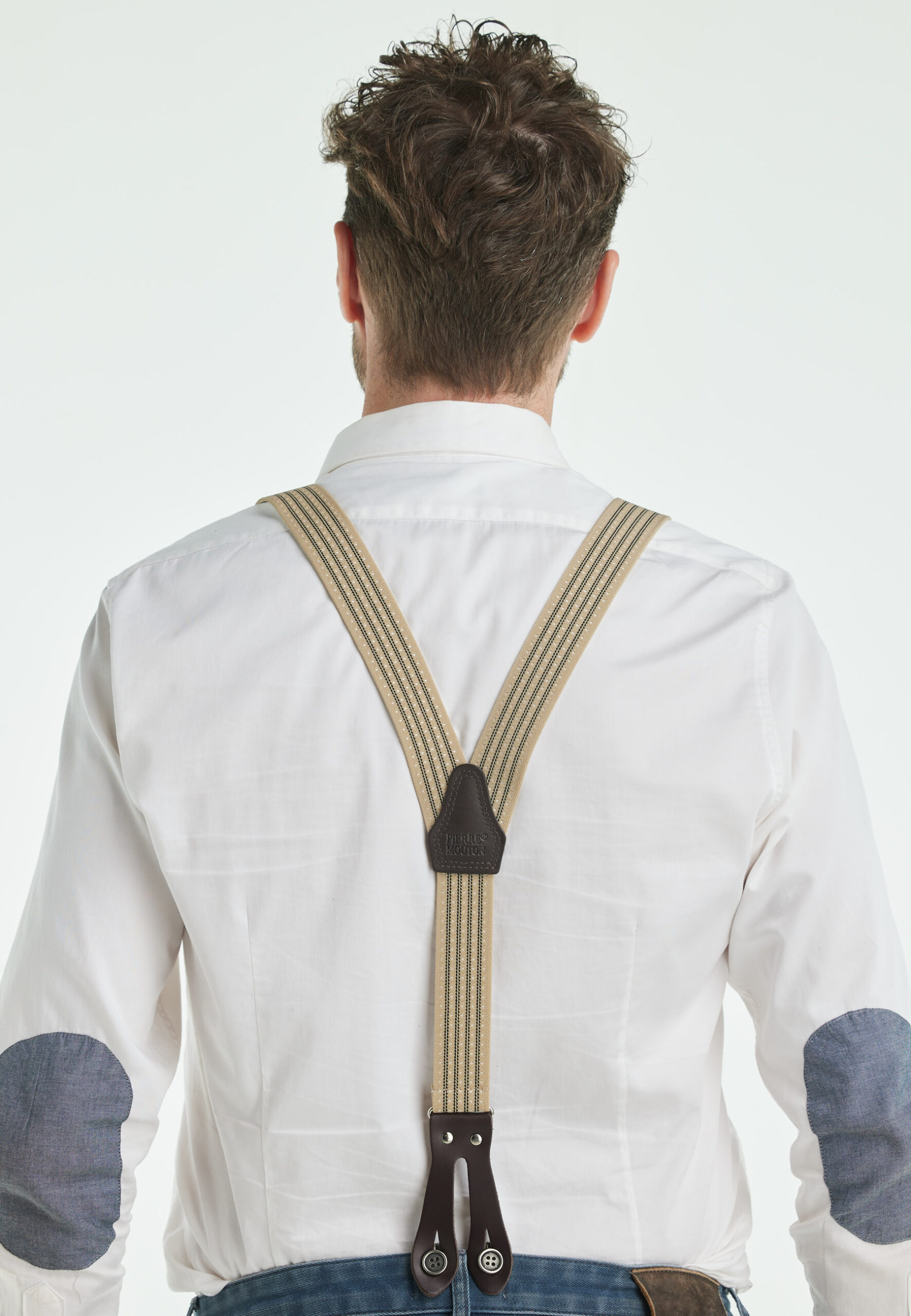 Handgemaakt van krachtig elastiek en echt rundleder patten. Het rugstukje is gemaakt van hetzelfde leder als de patten. Kwaliteitsbretel met prachtig effect vanwege dieper liggende stippen. Verkrijgbaar in 120cm of XL140cm.